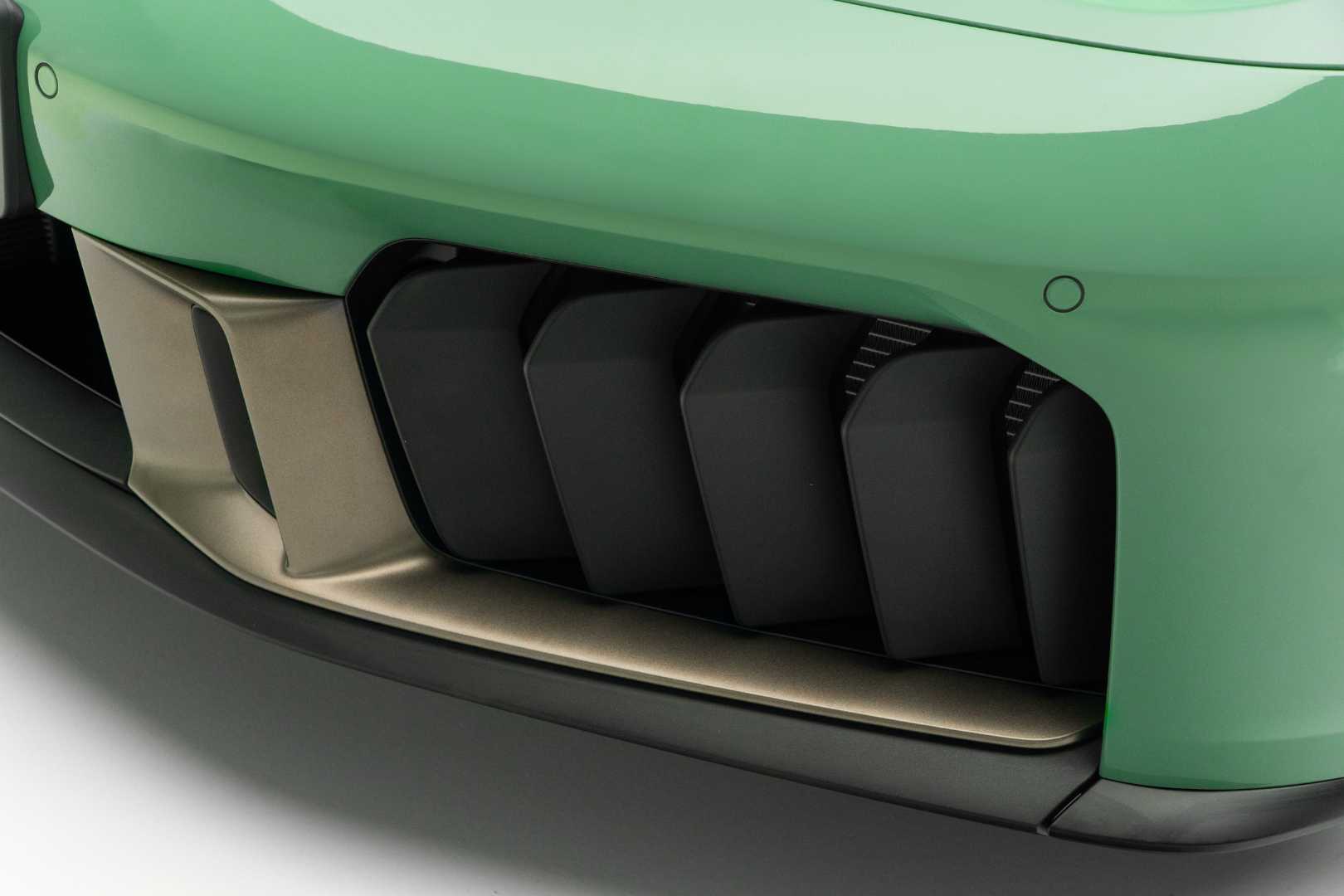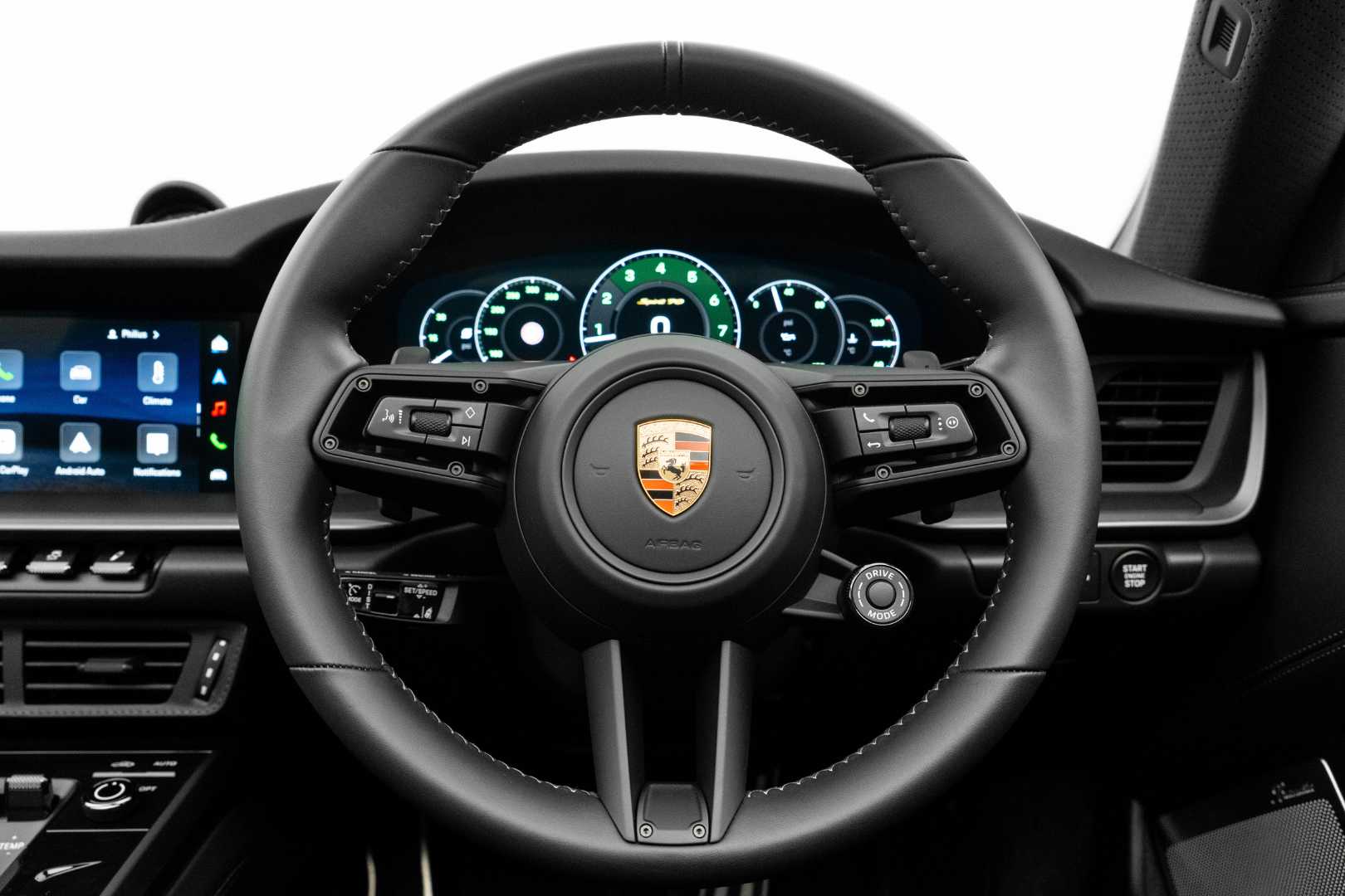 Attention to detail continues with a fully-digital 12.65-inch cluster display featuring white analog-style needles and green numerals—paying homage to classic 911s. The Sport Chrono stopwatch on the dashboard also receives green numerals and a white needle to complete the retro theme.