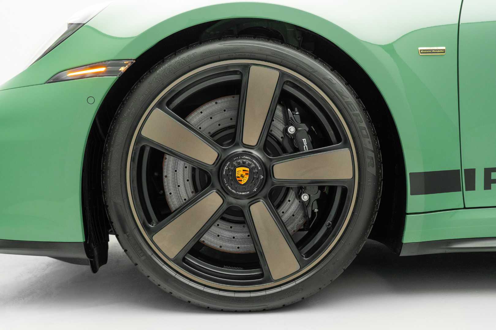To achieve an authentic vintage aesthetic, Porsche created a special front crest design reminiscent of the badge used in 1963. Gold accents also appear throughout the exterior, including the Porsche Exclusive Manufaktur emblem on the front fender, the Porsche Heritage badge on the engine grille, and gold Porsche lettering at the rear. The sides feature matte black graphics with Porsche lettering.