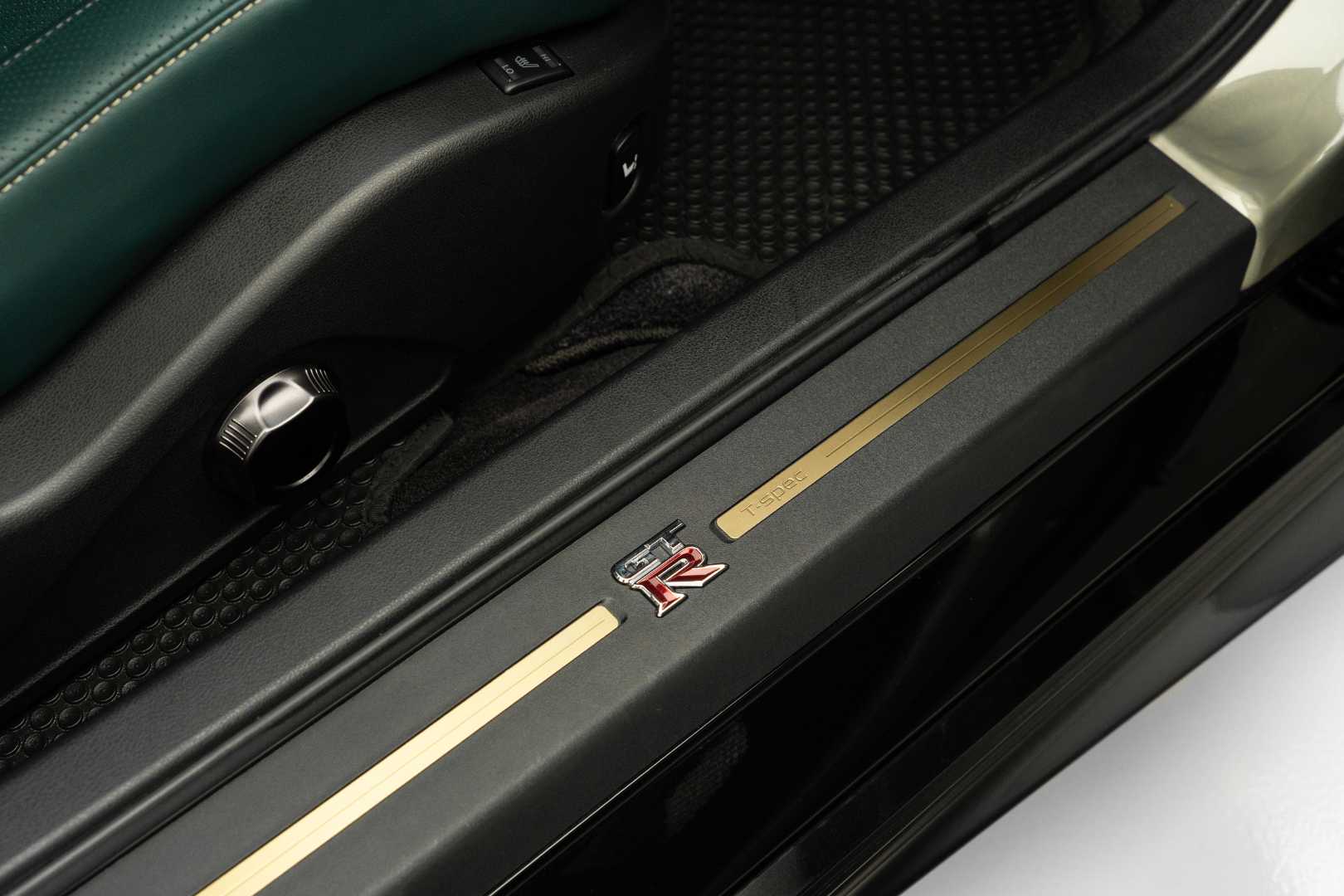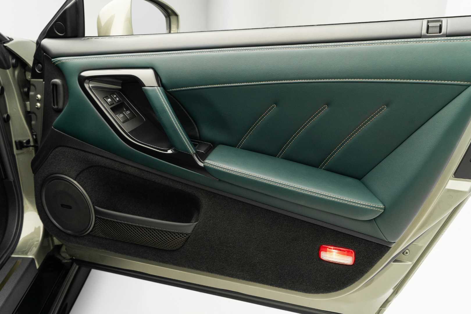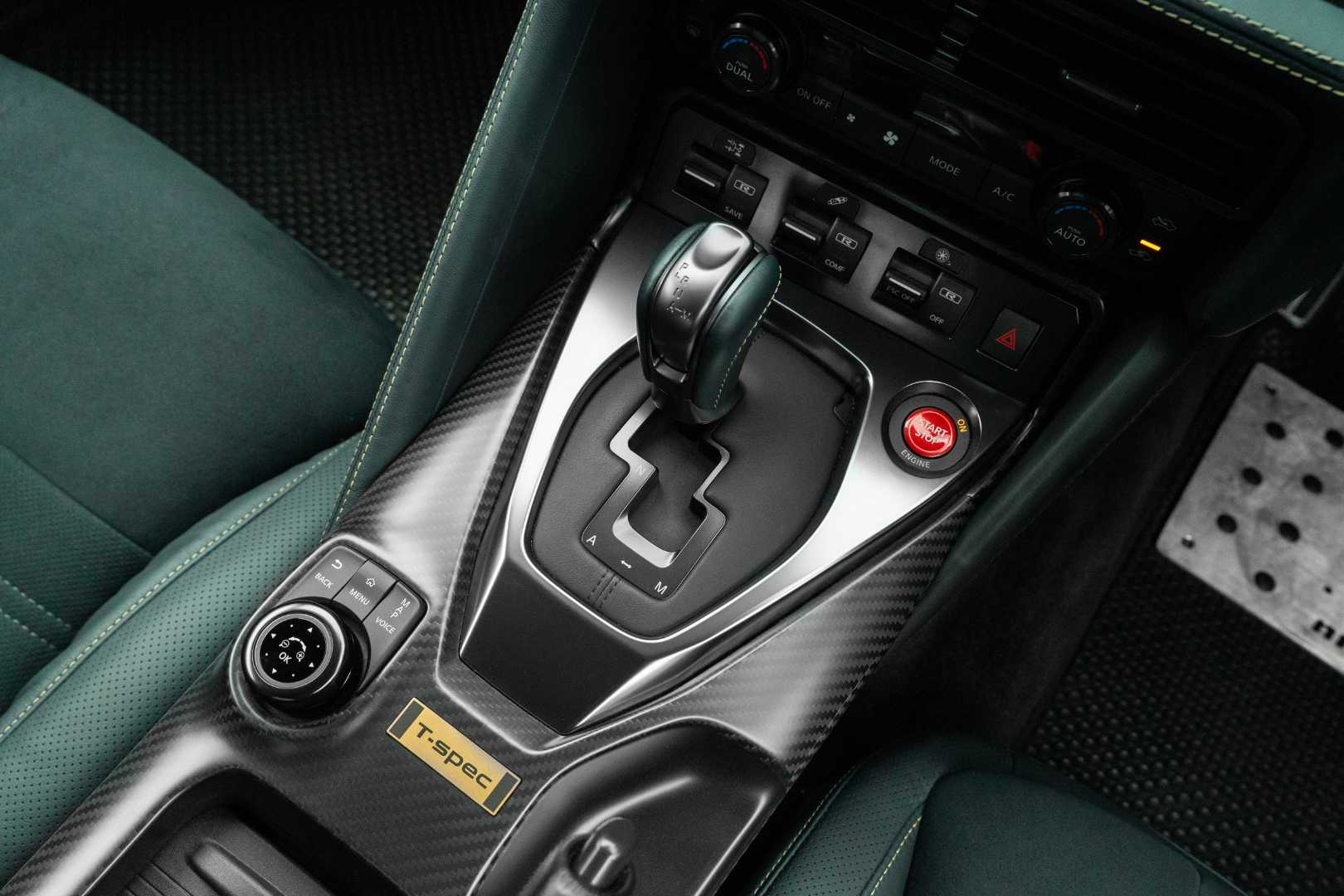 The GT-R R35 T-spec is based on the GT-R R35 Track Edition, further enhanced with a carbon-fiber rear spoiler, gold Rays aluminum wheels, carbon-ceramic brakes, and T-spec badges both inside and out. The interior features Mori Green leather seats, along with suede and Alcantara throughout the cabin.