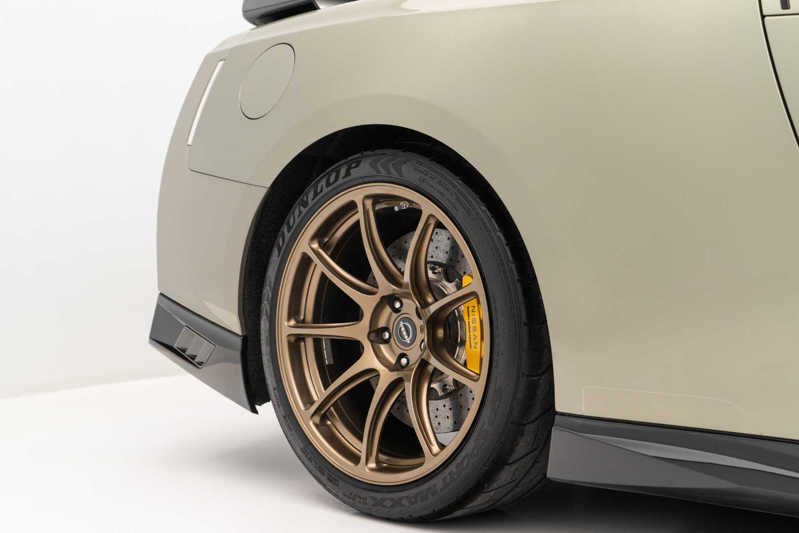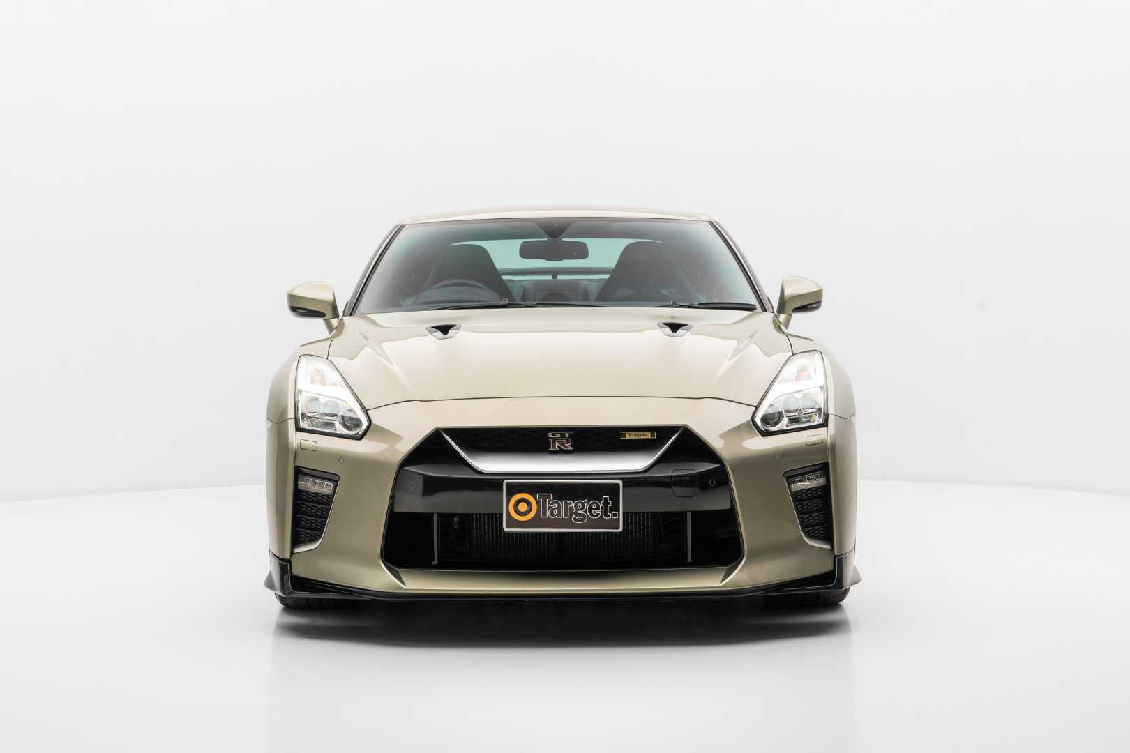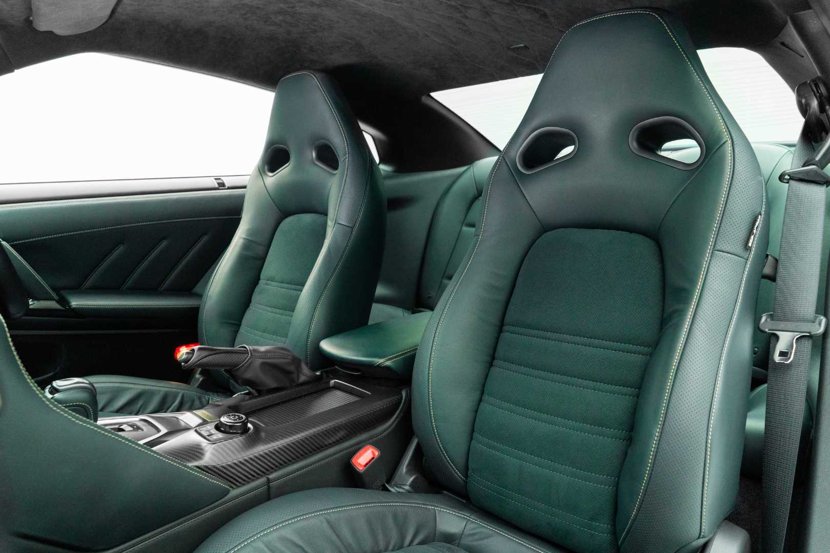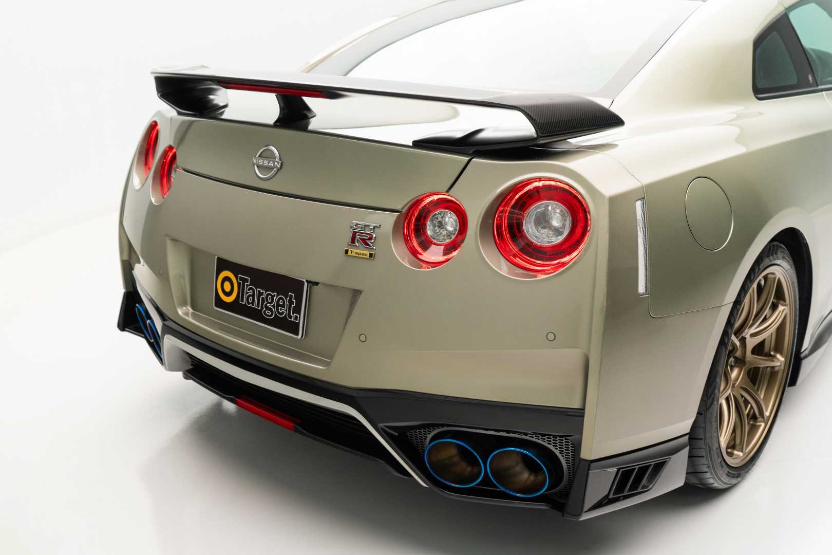 The GT-R R35 T-spec is based on the GT-R R35 Track Edition, further enhanced with a carbon-fiber rear spoiler, gold Rays aluminum wheels, carbon-ceramic brakes, and T-spec badges both inside and out. The interior features Mori Green leather seats, along with suede and Alcantara throughout the cabin.